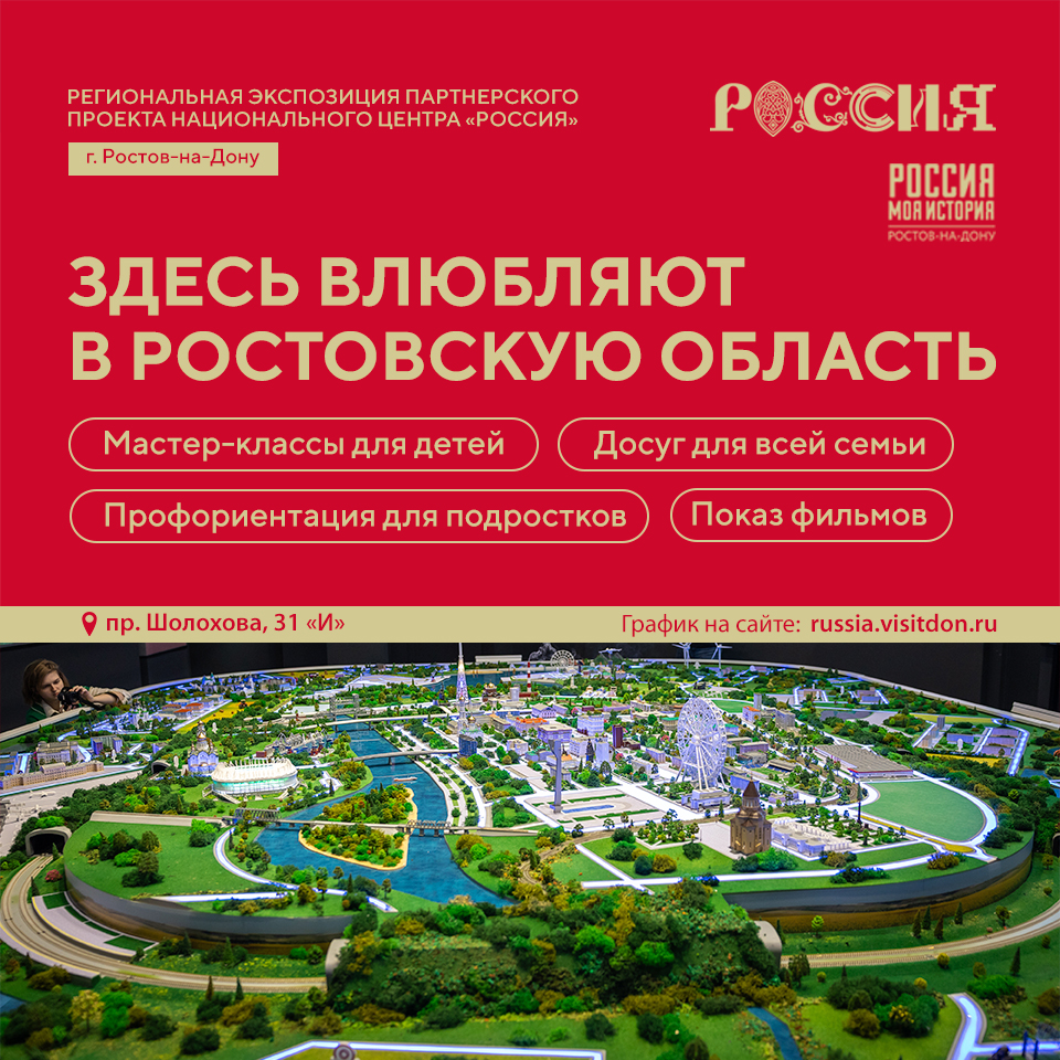 Президент России поддержал инициативу создания в каждом регионе экспозиций – наследников выставки «Россия». Проект объединяет культурное наследие страны и достижения регионов. В Ростовской области 25.01.2025 на базе парка «Россия – моя история» была запущена региональная экспозиция, полное название – региональная экспозиция партнёрского проекта национального центра «Россия». На экспозиции представлены 13 тематических площадок: от агропромышленности и цифровых технологий до туризма и волонтёрства.